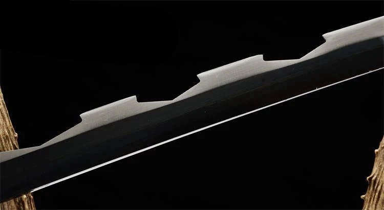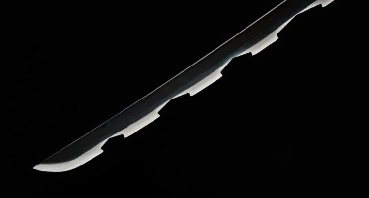 Inosuke Hashibira’s katana sword has a striking and distinctive design. Its 1045 carbon steel blade is irregularly serrated, rather than straight and smooth like other katanas, and the guard (Tsuba) is non-existent. The Tsuka Ito is white, as is the white PU leather scabbard. The sword’s finishes, including the precise degrees of inclination and dimensions, ensure a loyal replica of the anime originals, capturing the very essence of Inosuke Hashibira’s sword.