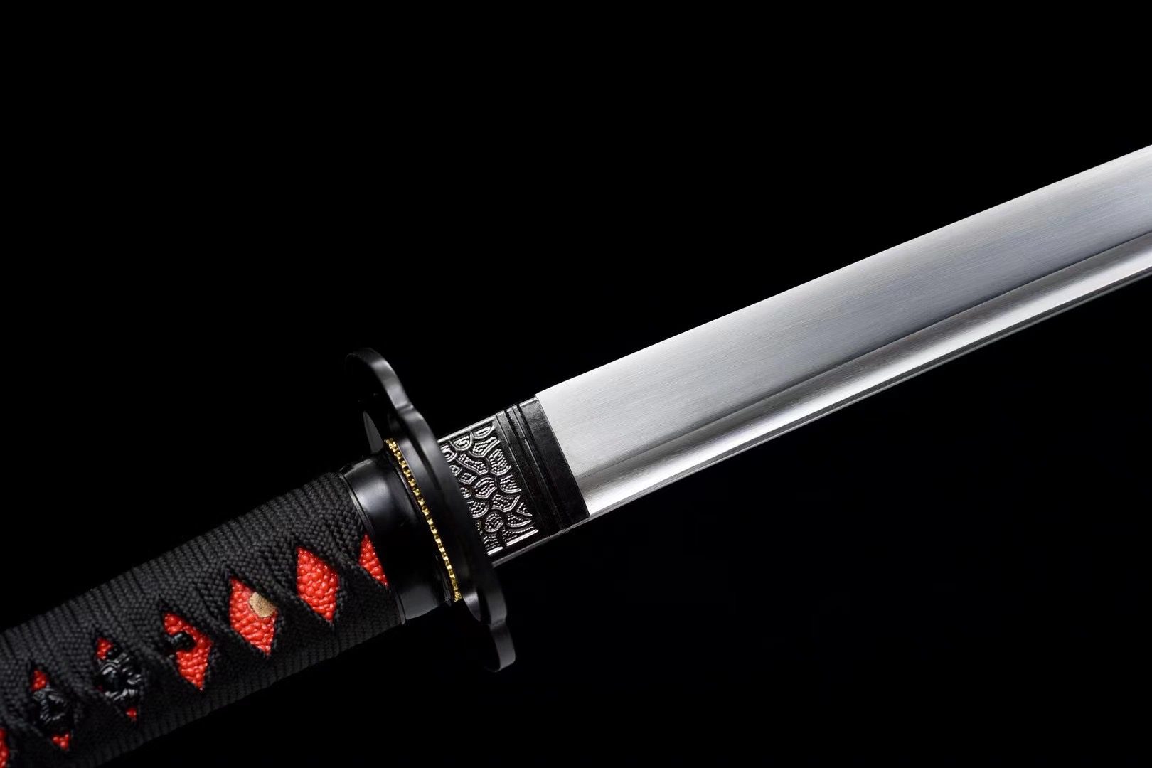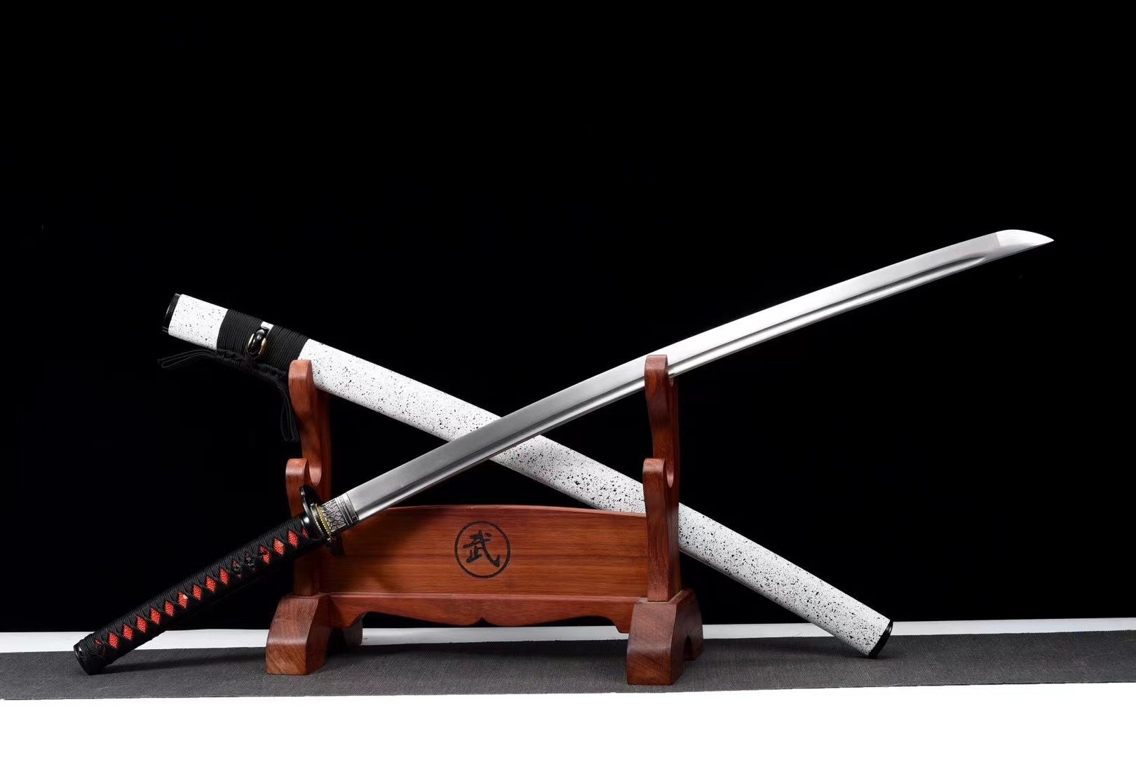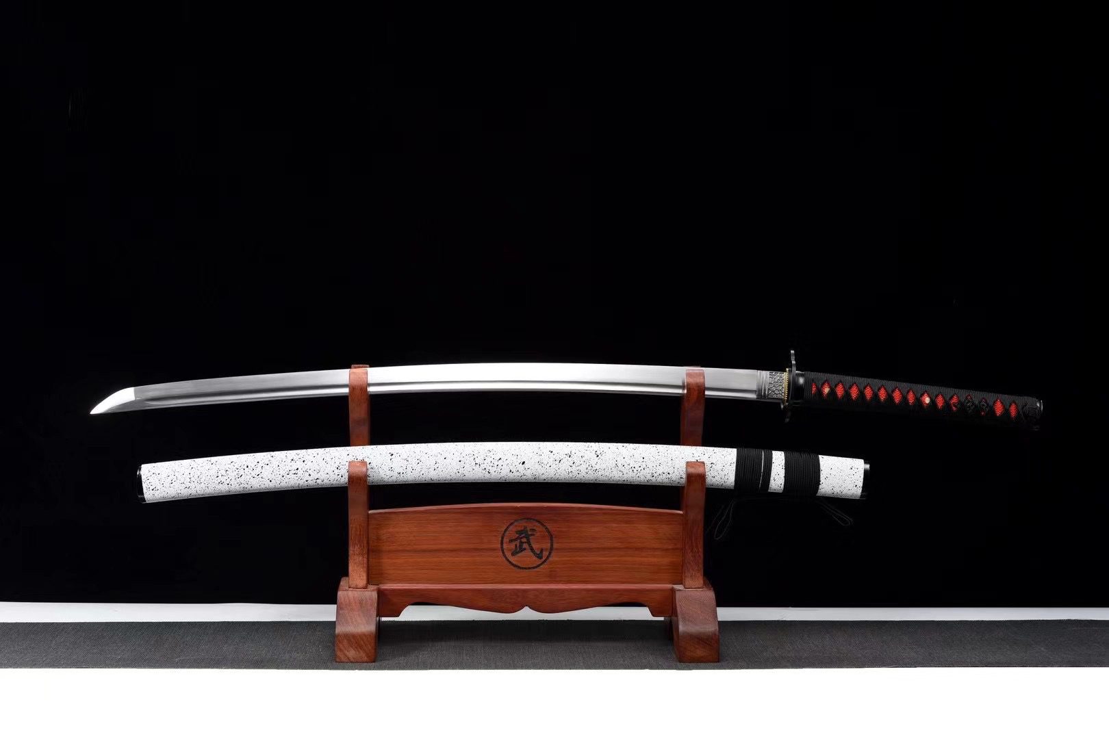 Its natural-colored T10 steel blade features a polished finish that subtly captures the light, while the bo-hi carved into its surface lightens the overall effect and produces a characteristic whistling sound when moved. The black alloy guard (tsuba) has a hollow cross floral shape. The handle (tsuka) combines the rough texture of red imitation stingray skin with black diamond-patterned braiding (tsuka-ito), creating a firm grip. The menuki represent a black dragon. The white lacquered wooden scabbard (saya) dotted with black spots evokes a starry night sky, complemented by a black sageo.