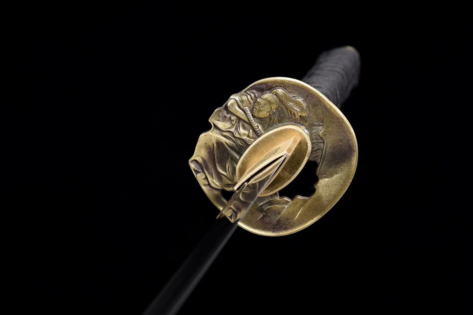 - Guard (Tsuba 鍔): splendid carved brass guard depicting a samurai on one side and a skull on the other.