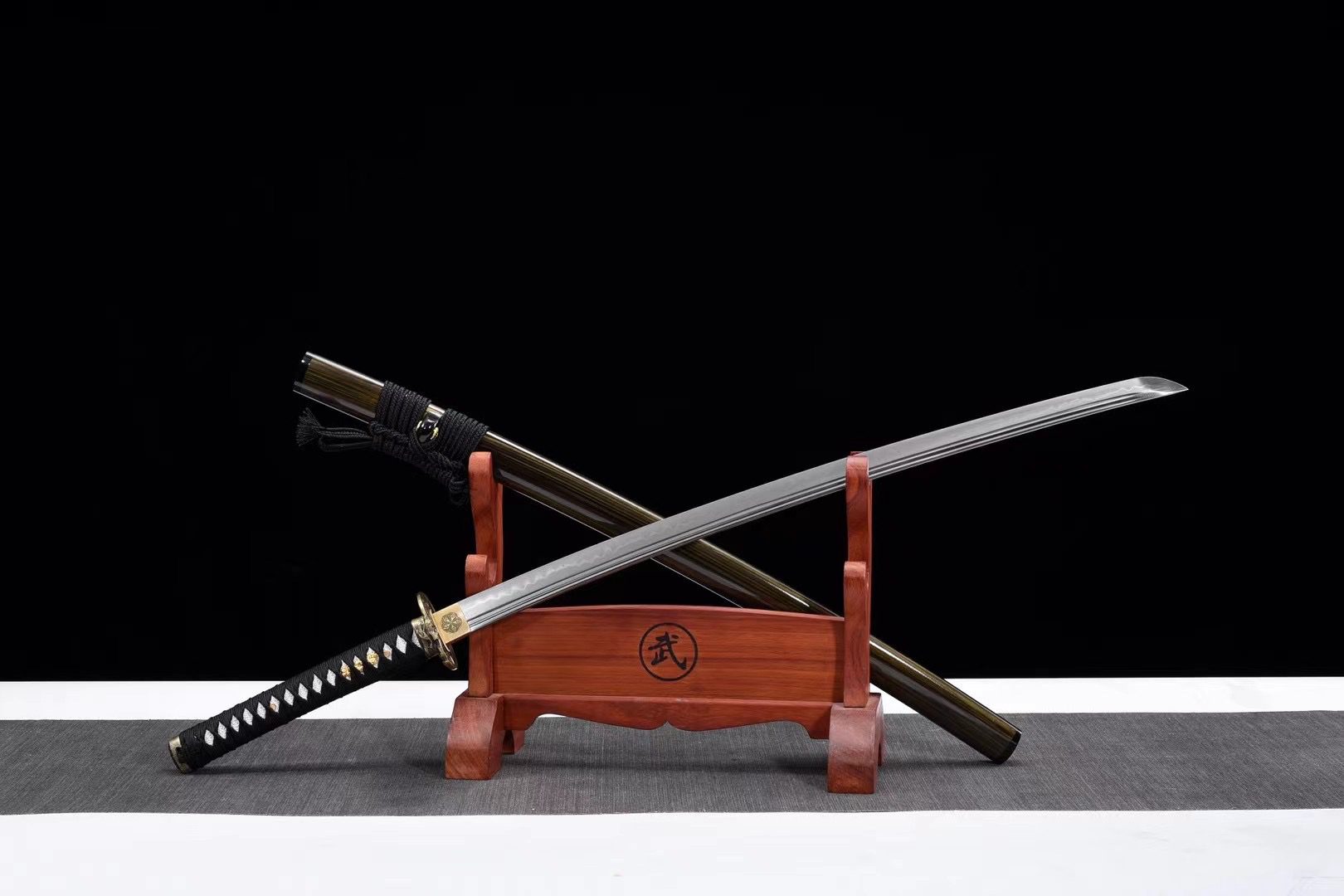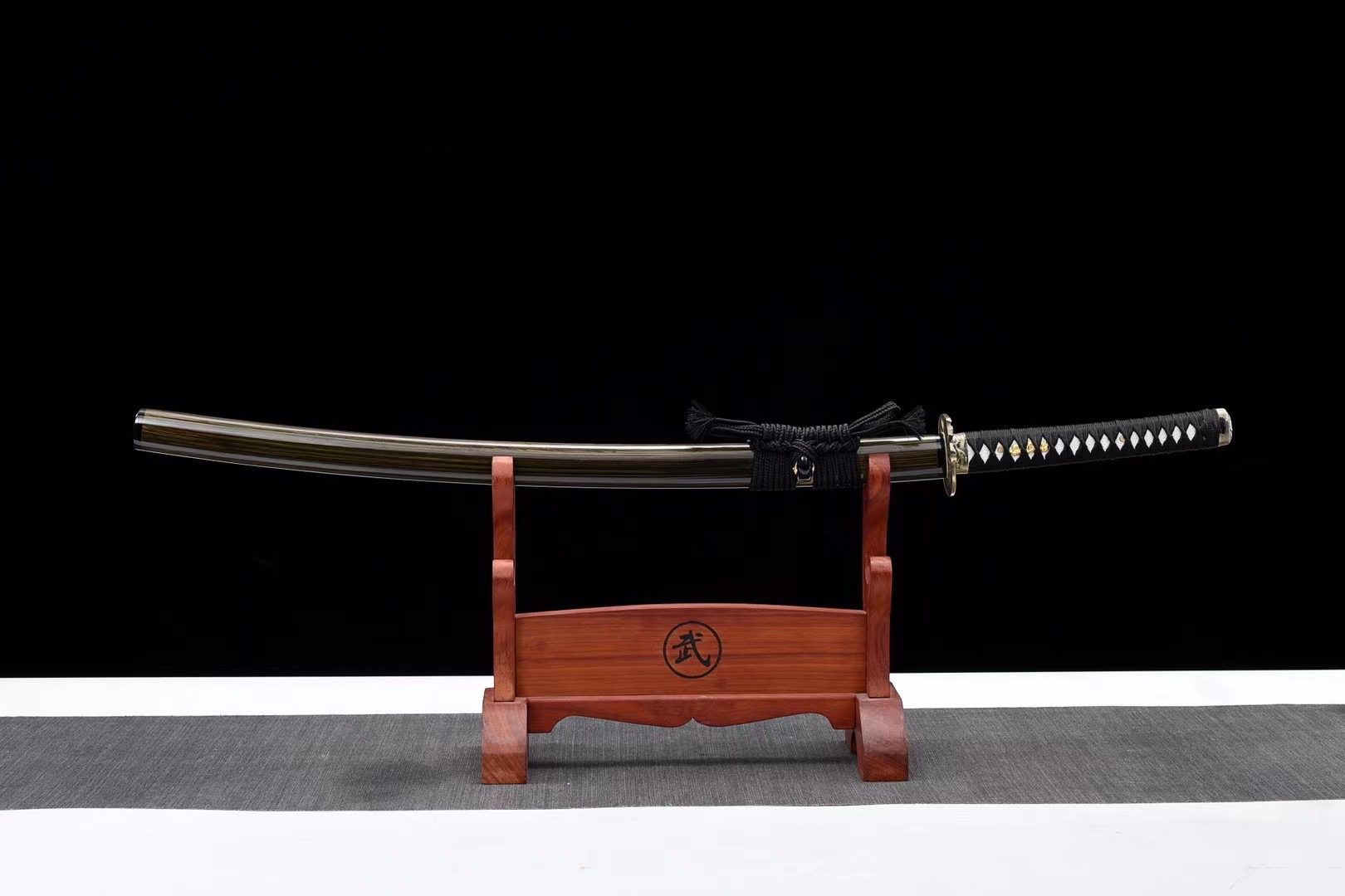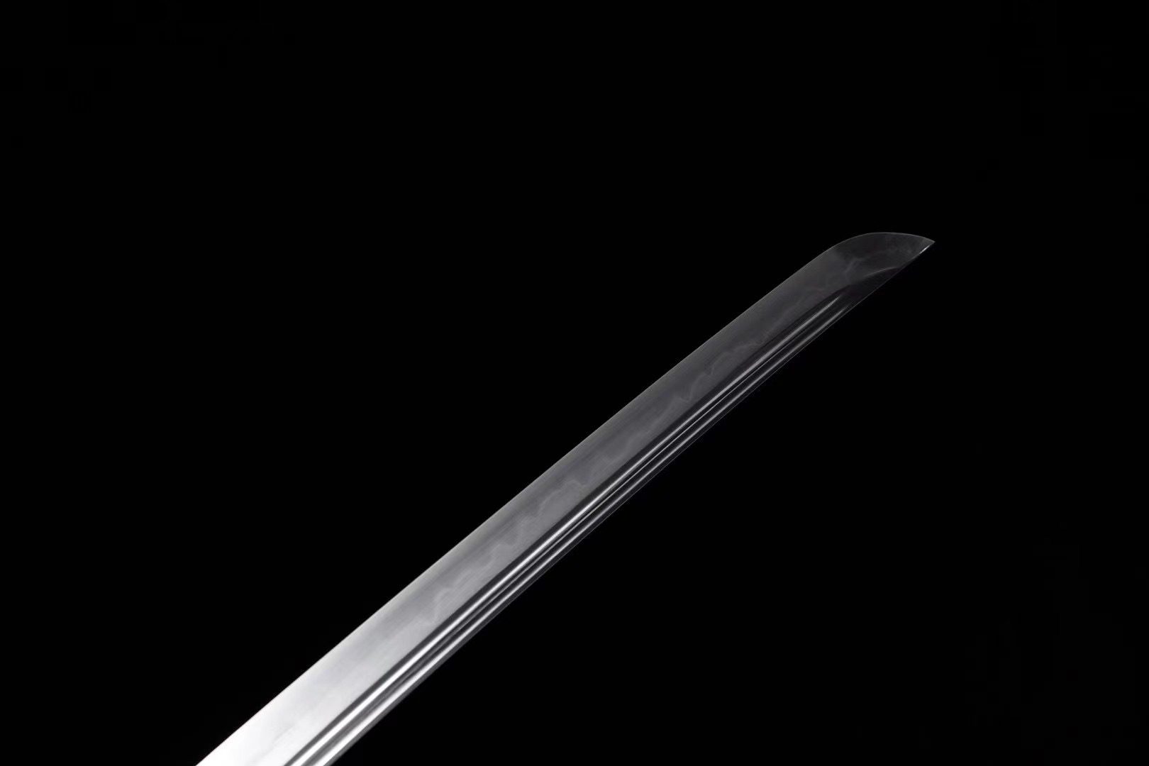 - Scabbard (Saya 鞘): transparent lacquered wood revealing the natural grain, with black Kojiri and Koiguchi.