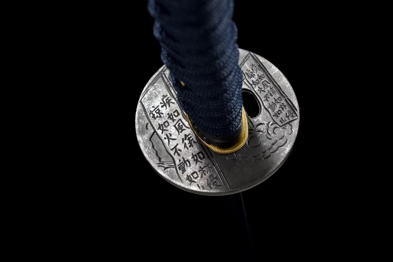 - Guard (Tsuba 鍔): round black alloy shape with carved samurai and Japanese symbols.