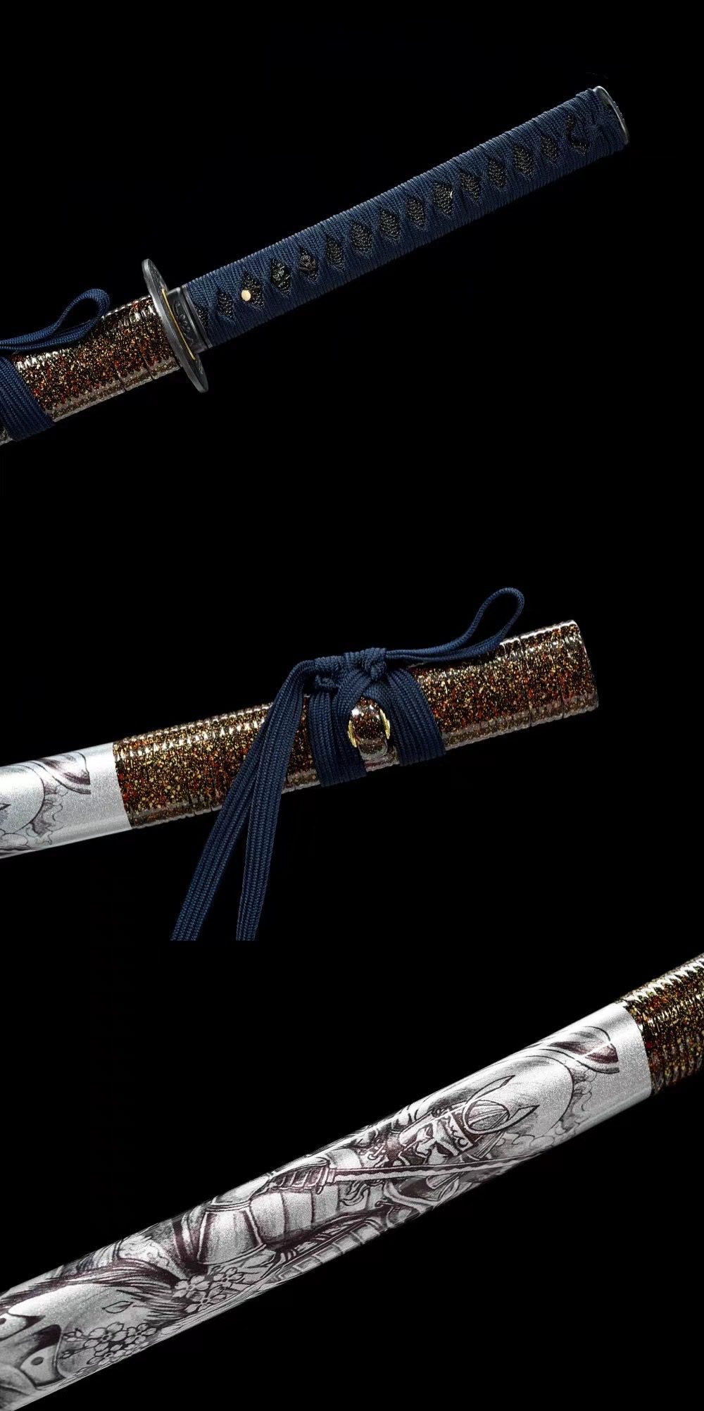 Its T10 steel blade reveals a polished surface that reflects light with natural elegance, while the bo-hi carves a harmonious groove that lightens the structure while producing a characteristic resonance. The round black alloy tsuba features detailed engravings depicting a samurai in action, surrounded by traditional Japanese symbols. The handle combines the rough texture of black faux stingray skin with blue diamond-pattern braiding, creating a firm and aesthetic grip. The grainy white scabbard is distinguished by its hand-painted samurai fresco.
