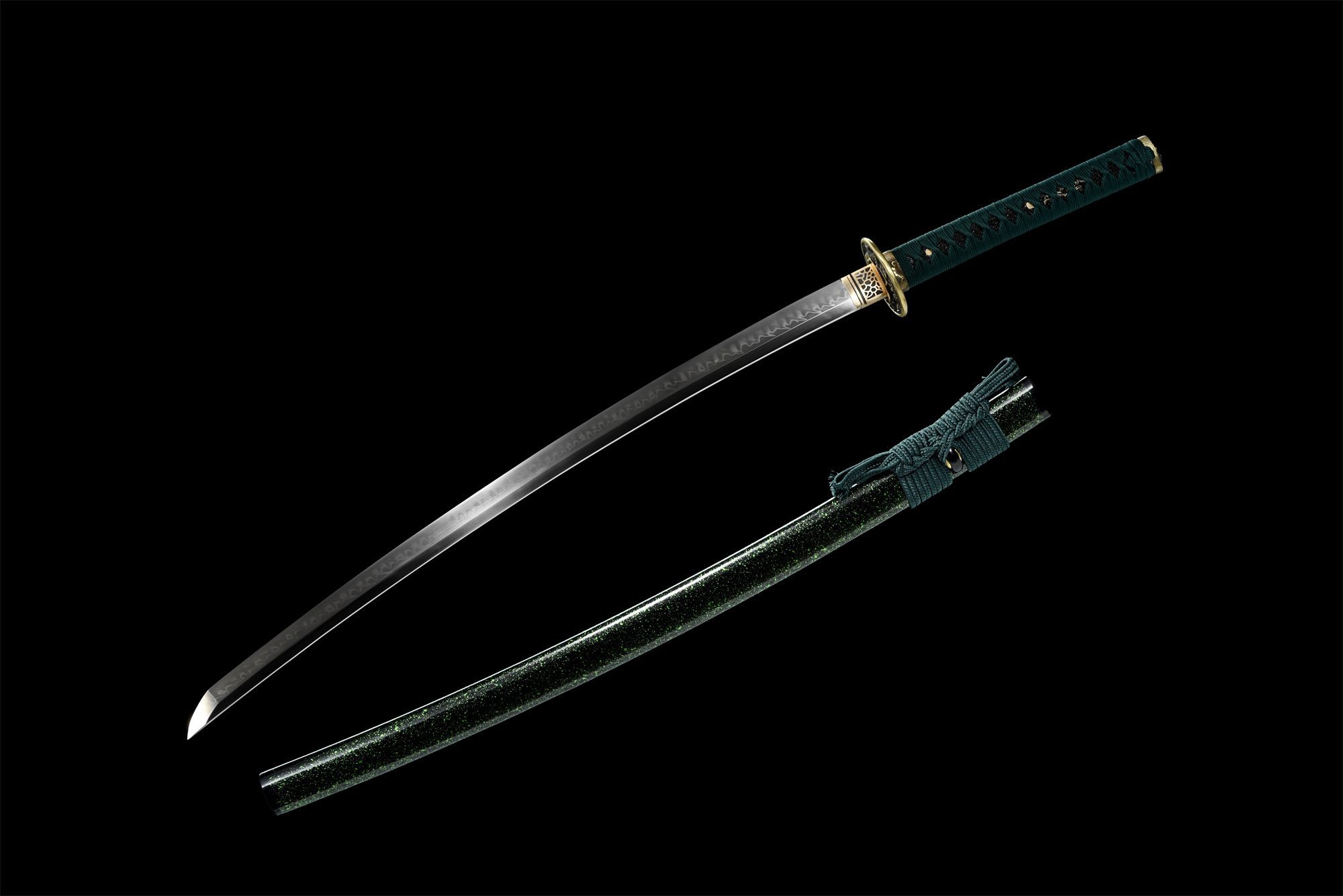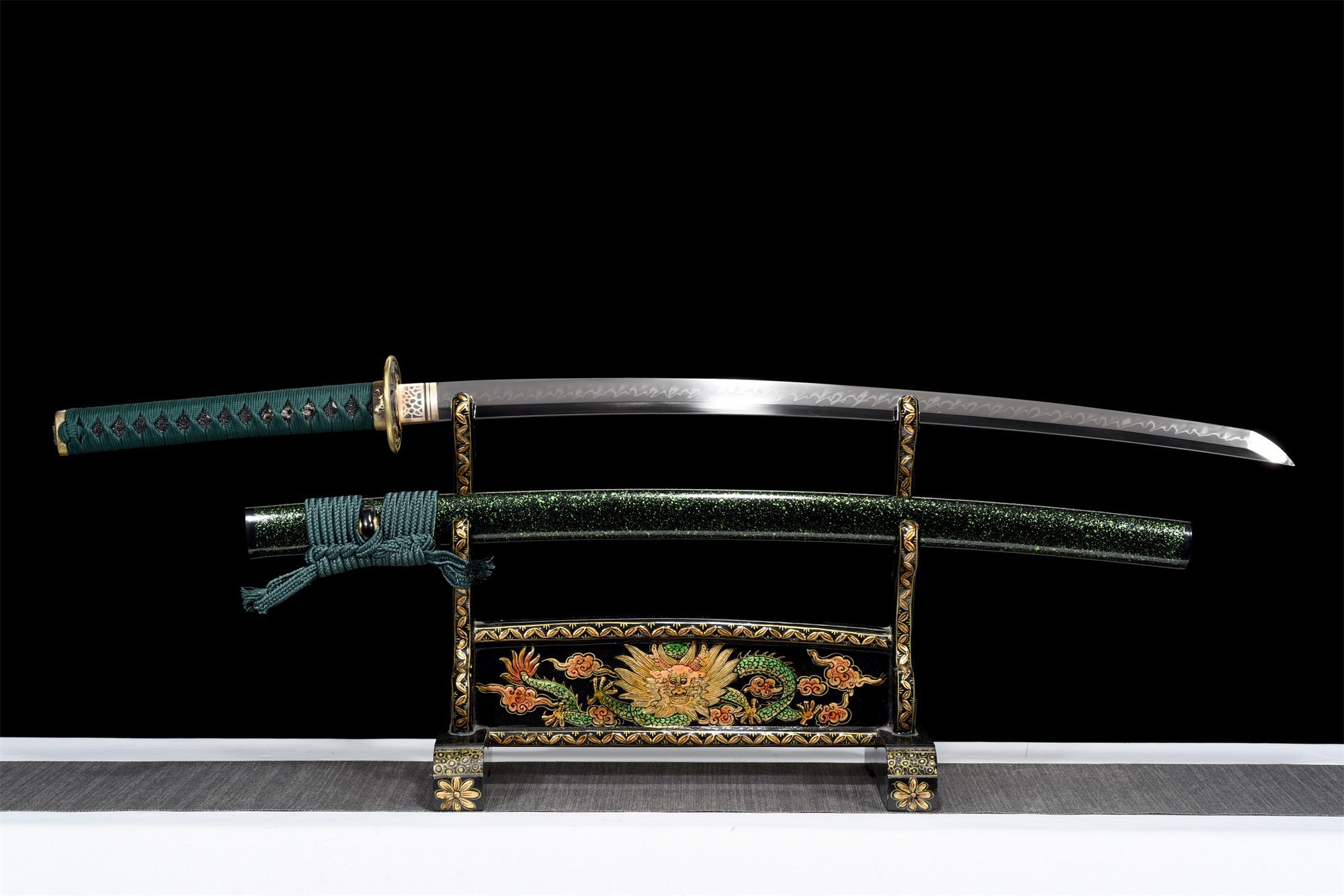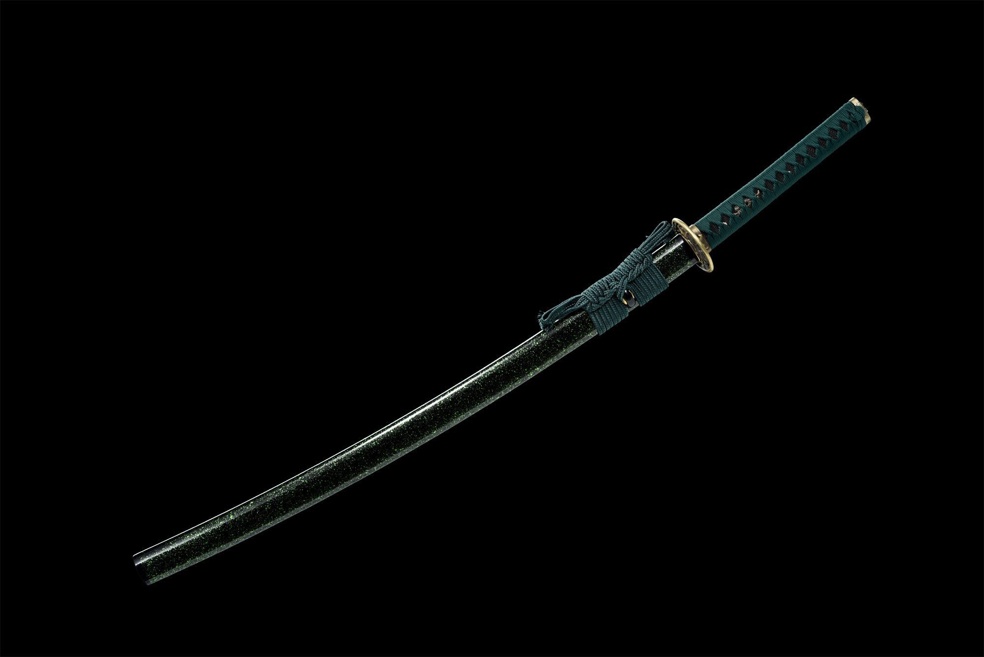 - Scabbard (Saya 鞘): Black and green grainy lacquered wood, genuine horn Koiguchi.