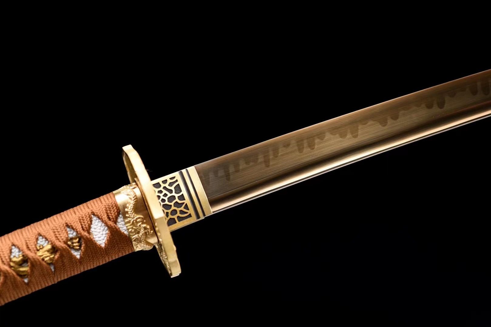 The T10 steel blade of the Kōkiba katana sword features an exceptional coppery hue that captures and reflects light with hypnotic intensity. The genuine hamon, achieved through differential tempering, forms a wavy line that separates areas of different hardness, creating a striking visual contrast on this golden surface. The bo-hi elegantly hollows the back of the blade, lightening its structure while producing that characteristic whistling sound when moved. The golden alloy guard (tsuba) features a dragon, a motif that is harmoniously repeated on the fuchi, while the kashira crowns the handle with a majestic dragon’s head. The handle reveals the authentic texture of white stingray skin (samegawa) beneath brown diamond-shaped braiding, punctuated with golden menuki representing dragons. The scabbard surprises with its transparent finish that reveals the natural beauty of the raw wood, framed by contrasting black ends and a two-tone black and copper sageo.