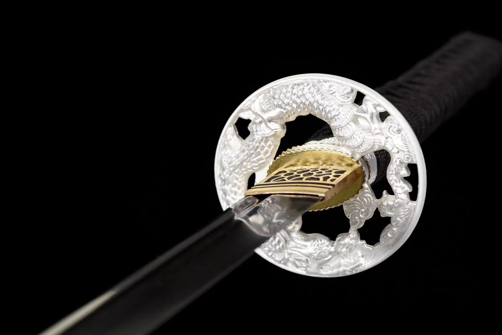 - Guard (Tsuba 鍔): silver-plated round, decorated with an engraved dragon.