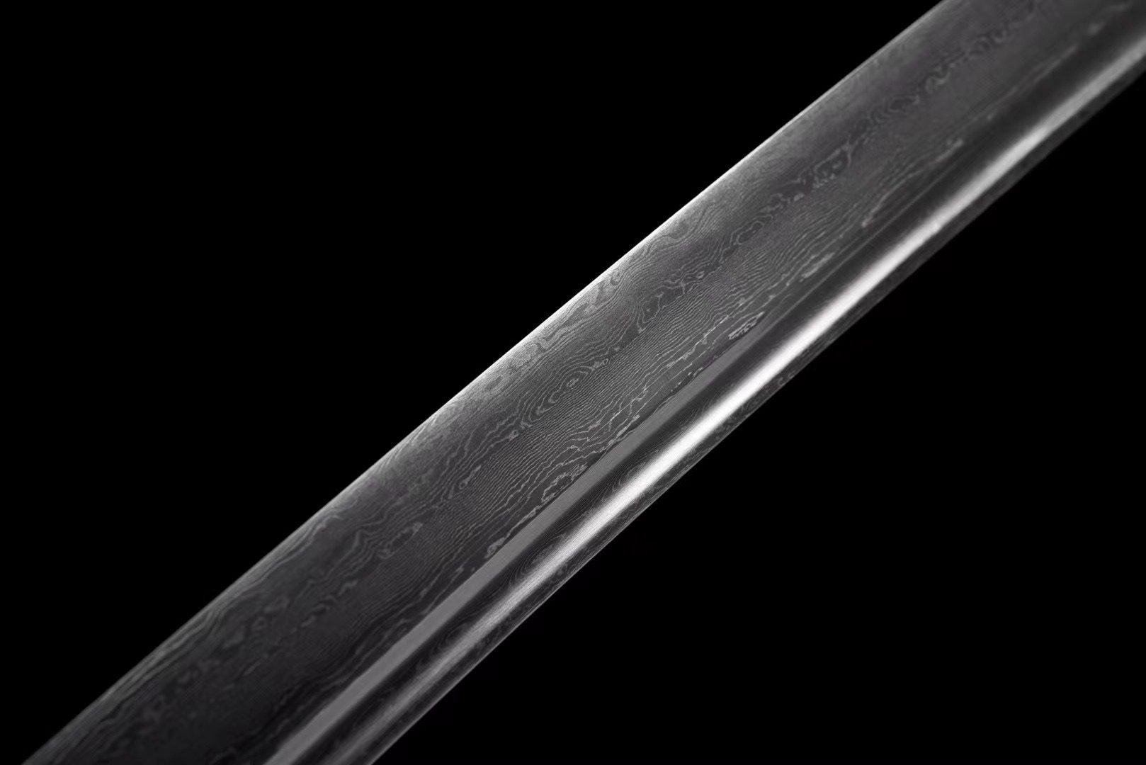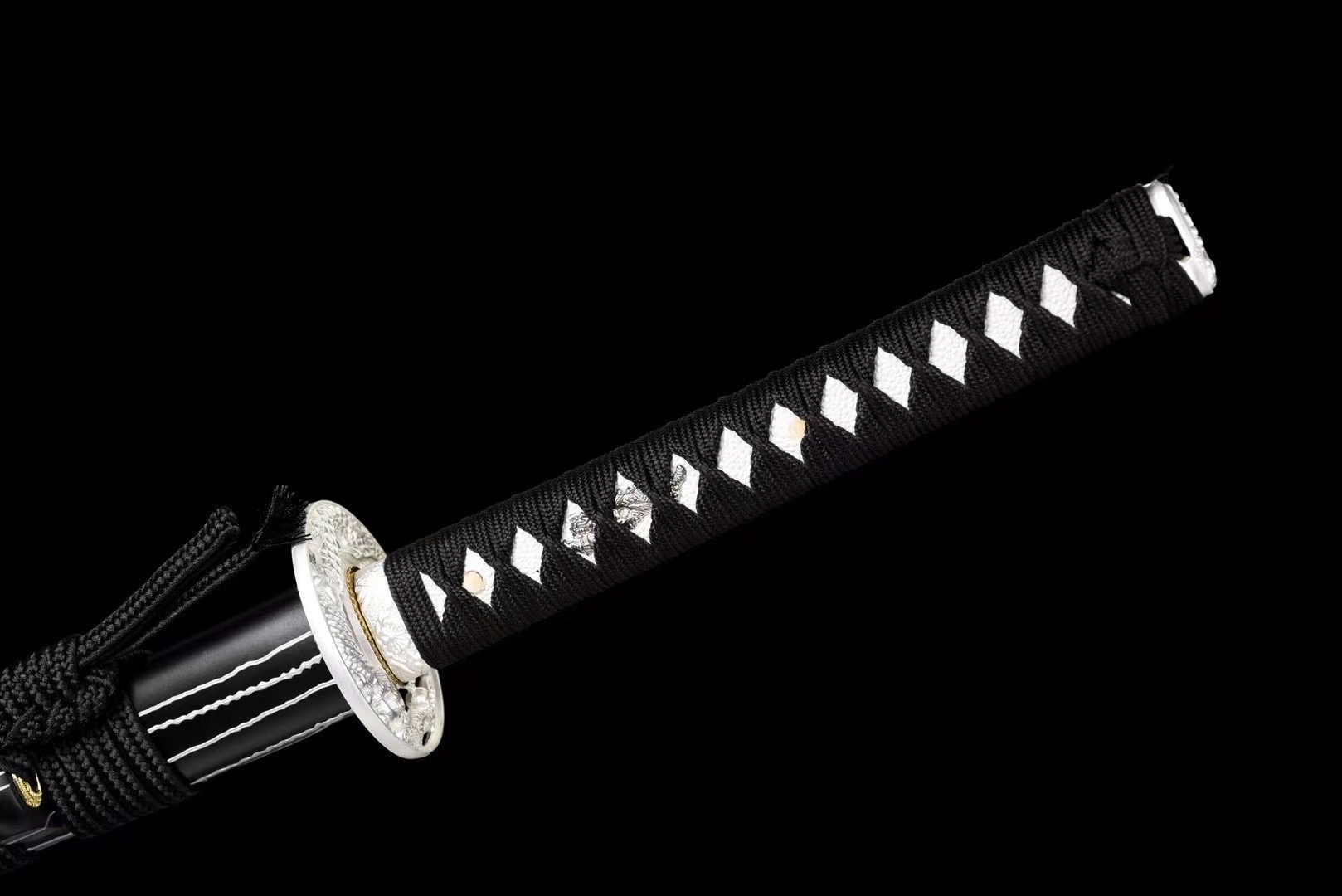 The black Damascus steel blade reveals undulating patterns reminiscent of lava flows frozen in obsidian. The bo-hi carves an elegant groove that lightens the blade while producing a characteristic whistling sound when moved. The round silver alloy tsuba contrasts beautifully with the dark blade, while the engraved dragon symbolizes the primordial force that lies dormant in the volcanic depths. The handle features authentic white samegawa covered with black diamond-patterned braiding, creating a striking visual balance. The menuki represent silver dragons that seem to emerge from the depths, while the fuchi and kashira, adorned with engraved flowers, add a touch of refinement. The black lacquered scabbard with white stripes evokes the natural streaks of polished obsidian, complemented by a black sageo that unifies the whole.