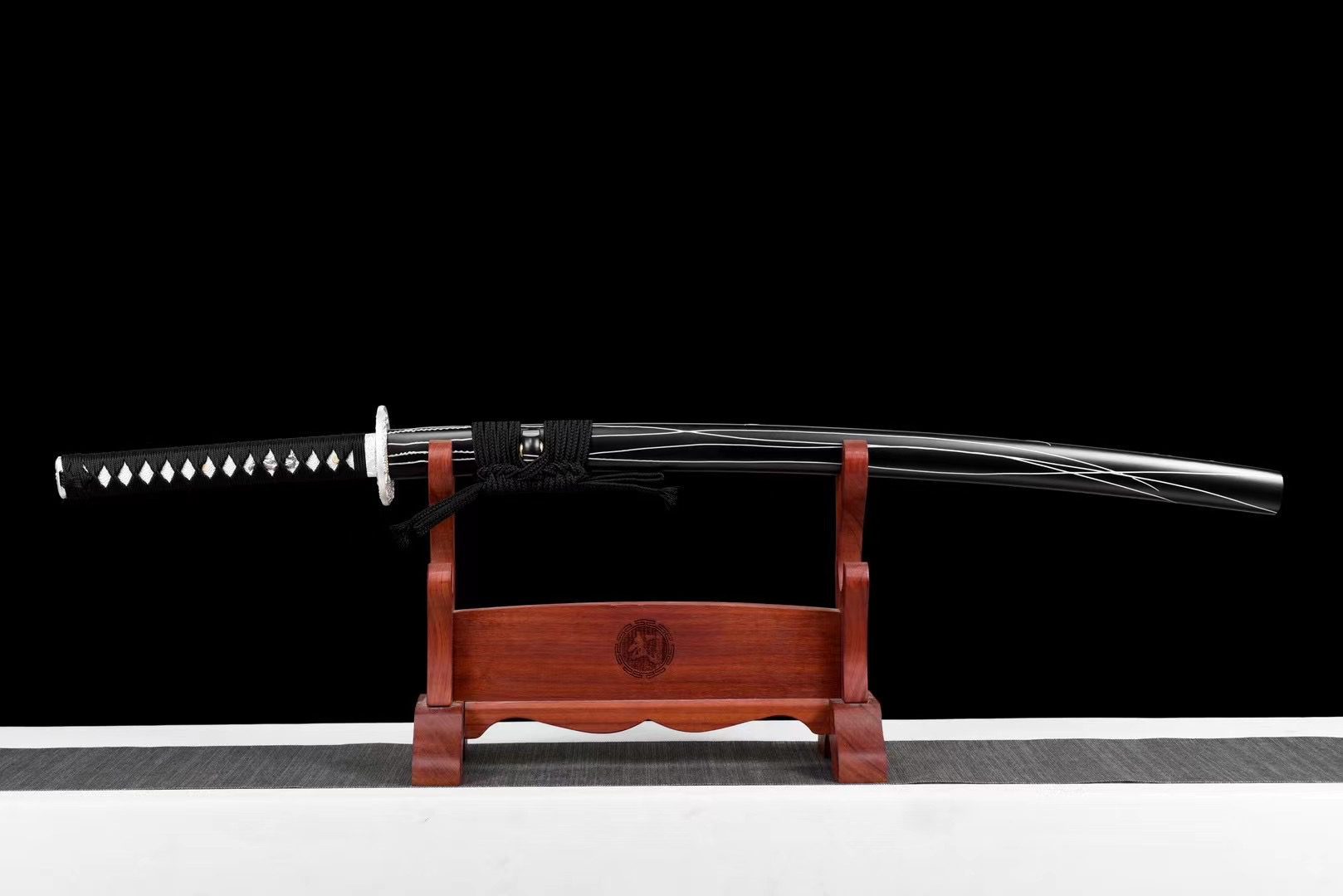 - Scabbard (Saya 鞘): black lacquered wood streaked with long white lines.