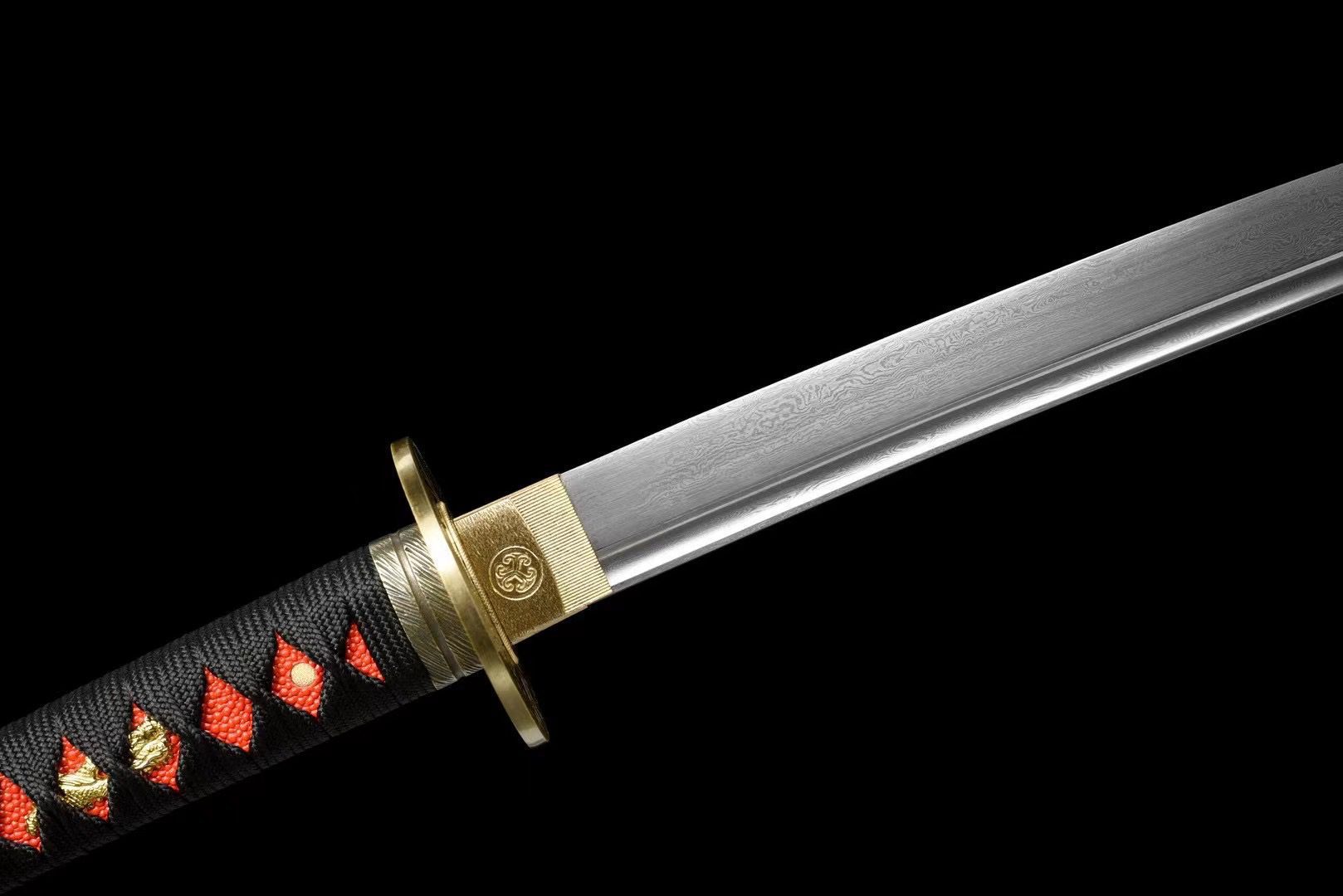 Its Damascus steel blade reveals undulating patterns reminiscent of the scales of the mythical dragon, while the bo-hi lightens the structure and produces a characteristic whistling sound when moved. The round tsuba in gilded brass features a detailed engraving of a dragon’s head, eternal guardian of the blade. The handle combines red stingray skin with black diamond-patterned braiding (tsuka-ito), creating a striking contrast that ensures a firm and comfortable grip. The gold menuki represent miniature dragons, while the brushed copper fuchi and kashira add a noble finish. The black and red lacquered wooden scabbard (saya), decorated with white zebra stripes, evokes the dancing flames around the dragon, complemented by a discreet black sageo.