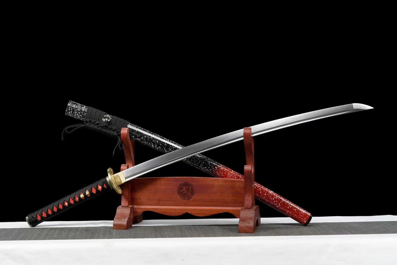 The Kōryūka (紅龍華) katana sword evokes the splendor of the scarlet dragon, a symbol of power and nobility in Japanese tradition. This name combines “Kō” (紅) meaning scarlet red, ‘Ryū’ (龍) for dragon, and “Ka” (華) representing floral magnificence. This katana thus embodies the fusion between the raw power of the legendary dragon and the refined elegance of the cherry blossom, creating a perfect harmony between power and beauty.