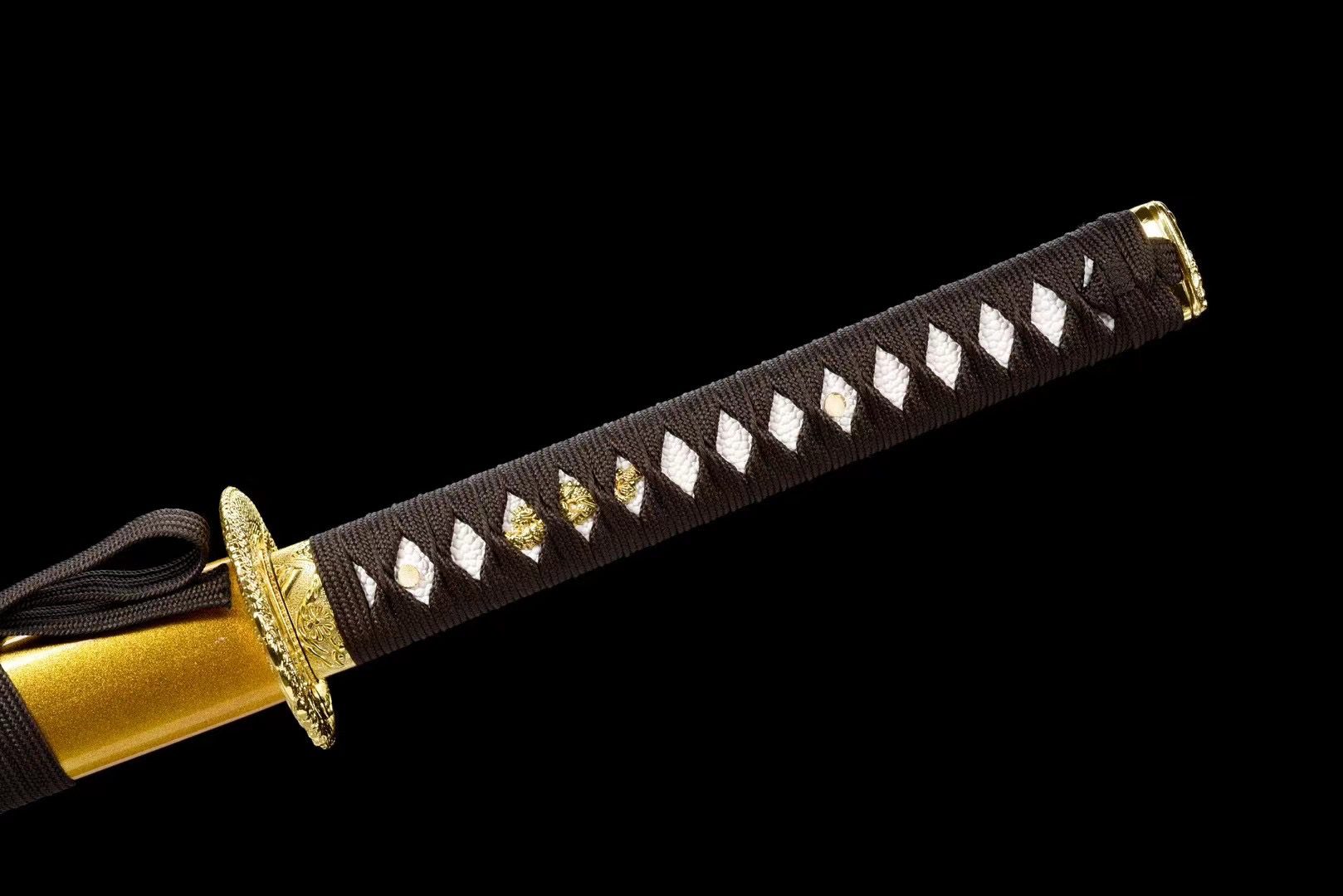 Its T10 steel blade features a steel and rust finish that evokes the natural patina of time, while the genuine hamon notare, achieved through differential tempering, creates irregular waves along the cutting edge. The bo-hi lightens the structure while producing the characteristic whistling sound during movement. The round golden tsuba features a dragon coiled in a perfect circular composition, symbolizing eternity and the cosmic cycle. The handle combines white stingray skin (samegawa) and wood, wrapped in brown braiding (tsuka-ito) in a diamond pattern that ensures a firm and elegant grip. The menuki represent golden dragons emerging from beneath the braiding, while the engraved golden alloy fuchi and kashira complete the decorative harmony. The hammered brass habaki fits perfectly into the yellow lacquered wooden scabbard, adorned with a dragon fresco that unfurls along its entire length. The brown sageo braids the connection between the wearer and their weapon.