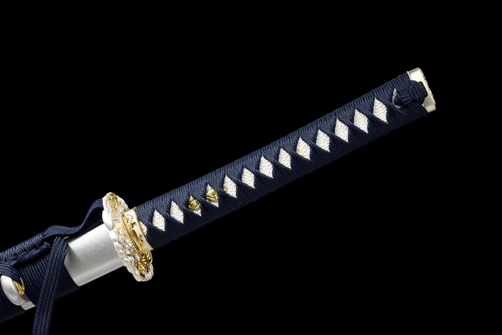 Its T10 steel blade features a deep blue hue reminiscent of the reflections of a stream in the morning light. This unique coloring blends perfectly with the round silver and gold alloy tsuba, adorned with symbols of fish swimming in an eternal aquatic ballet. The handle combines the rough texture of white faux stingray skin with the warmth of wood, while the blue diamond-patterned braiding creates a refined geometric effect. The menuki represent a golden dragon, mythical guardian of the celestial waters, and the brushed brass habaki bears a traditional kamon. The grainy white lacquered wooden scabbard features a delicate fresco of goldfish, creating a striking contrast with the blue sageo that completes this chromatic symphony.
