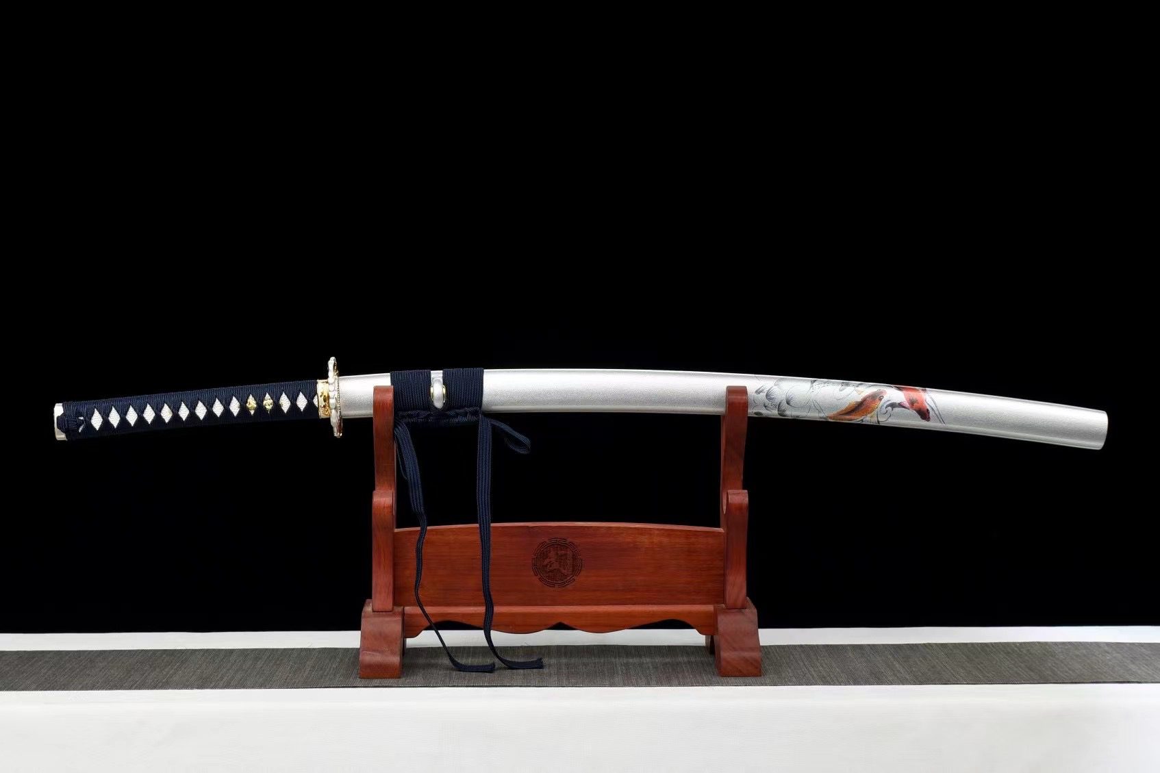 - Scabbard (Saya 鞘): made of grainy white lacquered wood with a fresco of goldfish.