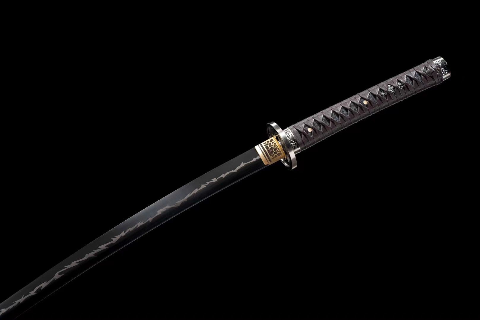 Its black T10 steel blade is adorned with a magnificent lightning bolt, while its polished surface reveals subtle reflections reminiscent of electric flashes. The round silver alloy tsuba features a precisely engraved tripod of life, an ancient symbol of the balance between the three fundamental forces of the universe. The handle combines black faux stingray skin with traditional wood, covered with black tsuka-ito braiding with diamond patterns reminiscent of dragon scales. The menuki represent black dragons, mythical guardians of wisdom and transformation. The brown leather scabbard adds a touch of earthly elegance, complemented by the matching sageo that facilitates traditional carrying.