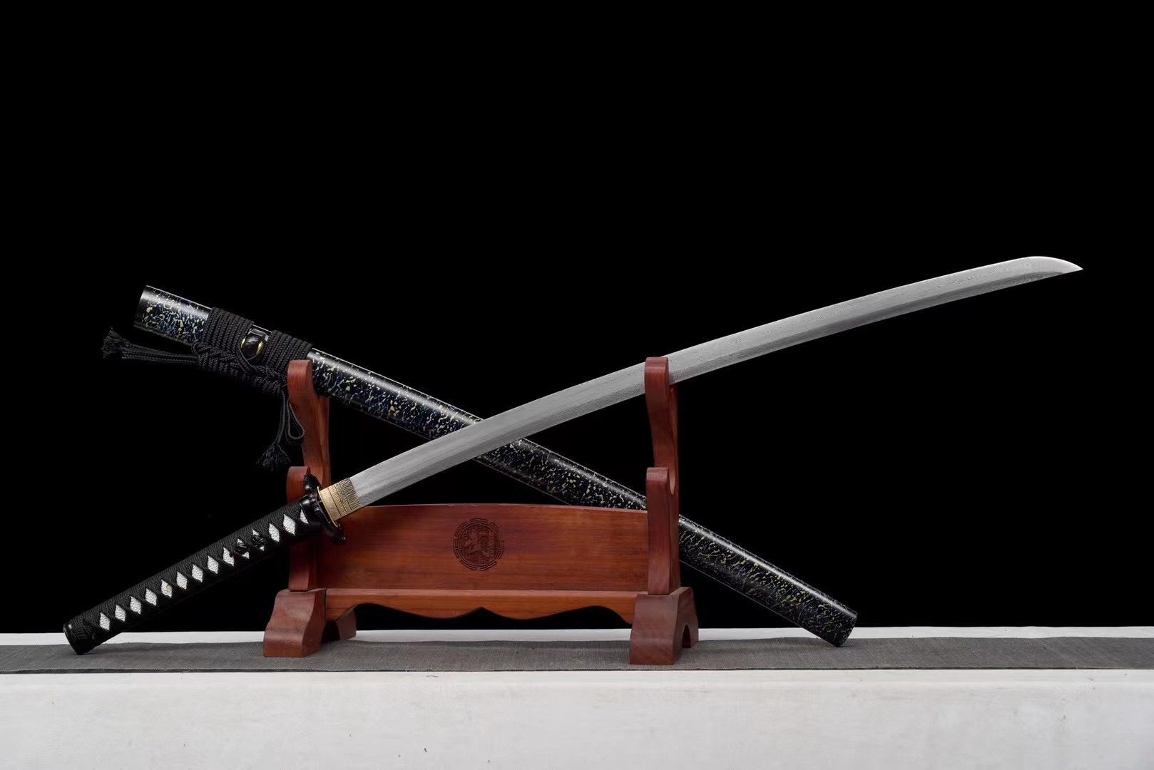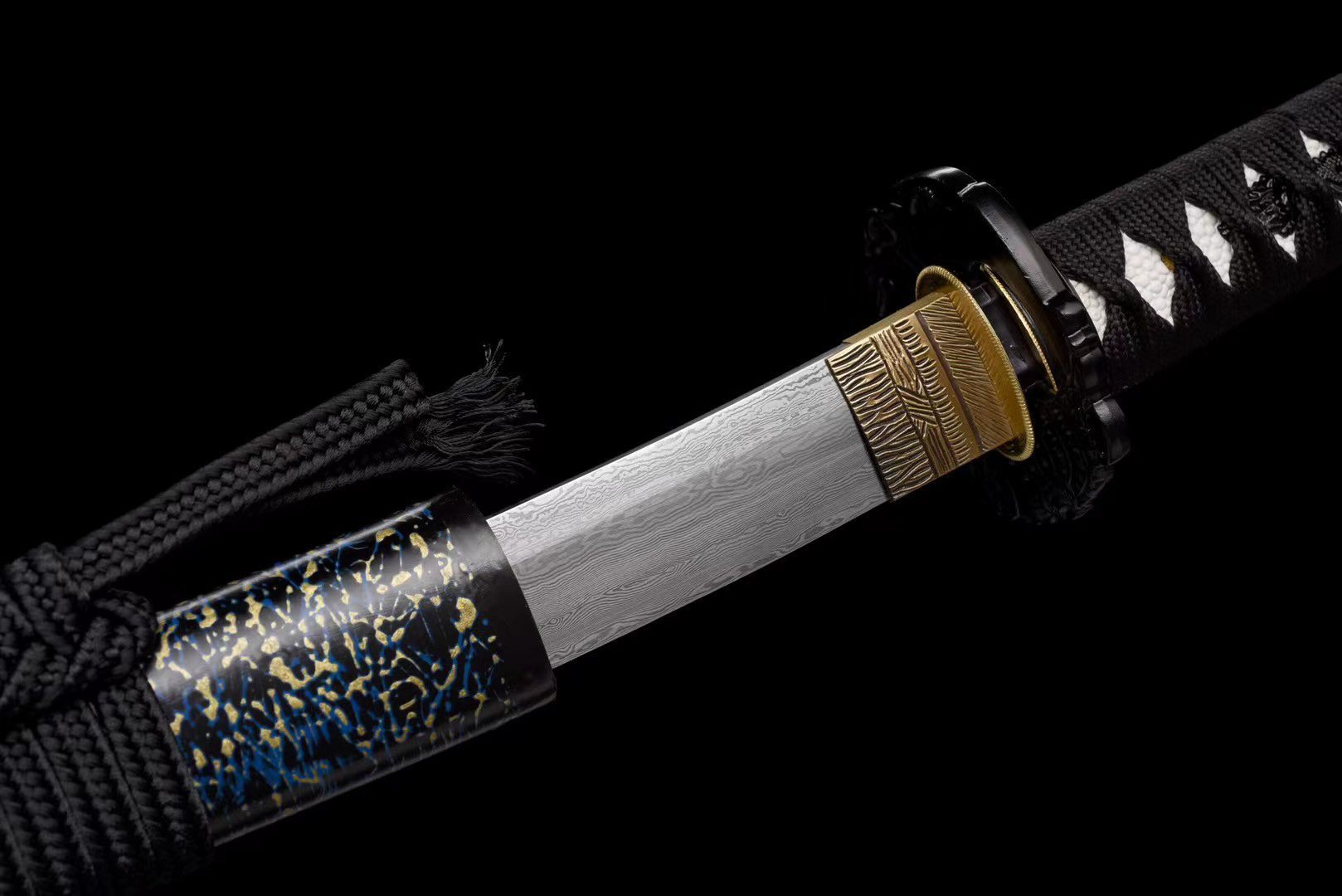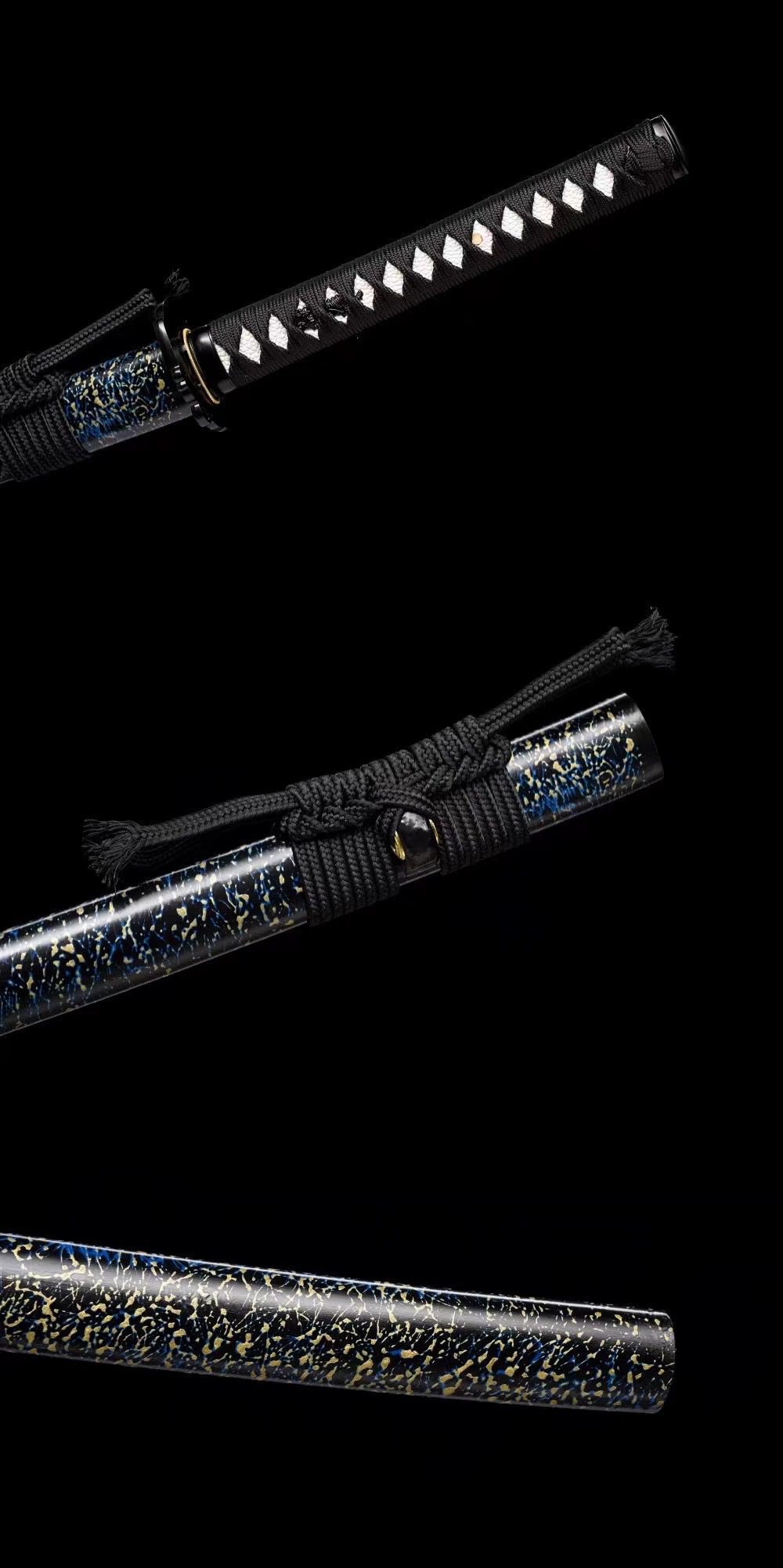 - Scabbard (Saya 鞘): made of black lacquered wood with blue and gold highlights, black ends (Kojiri and Koiguchi).