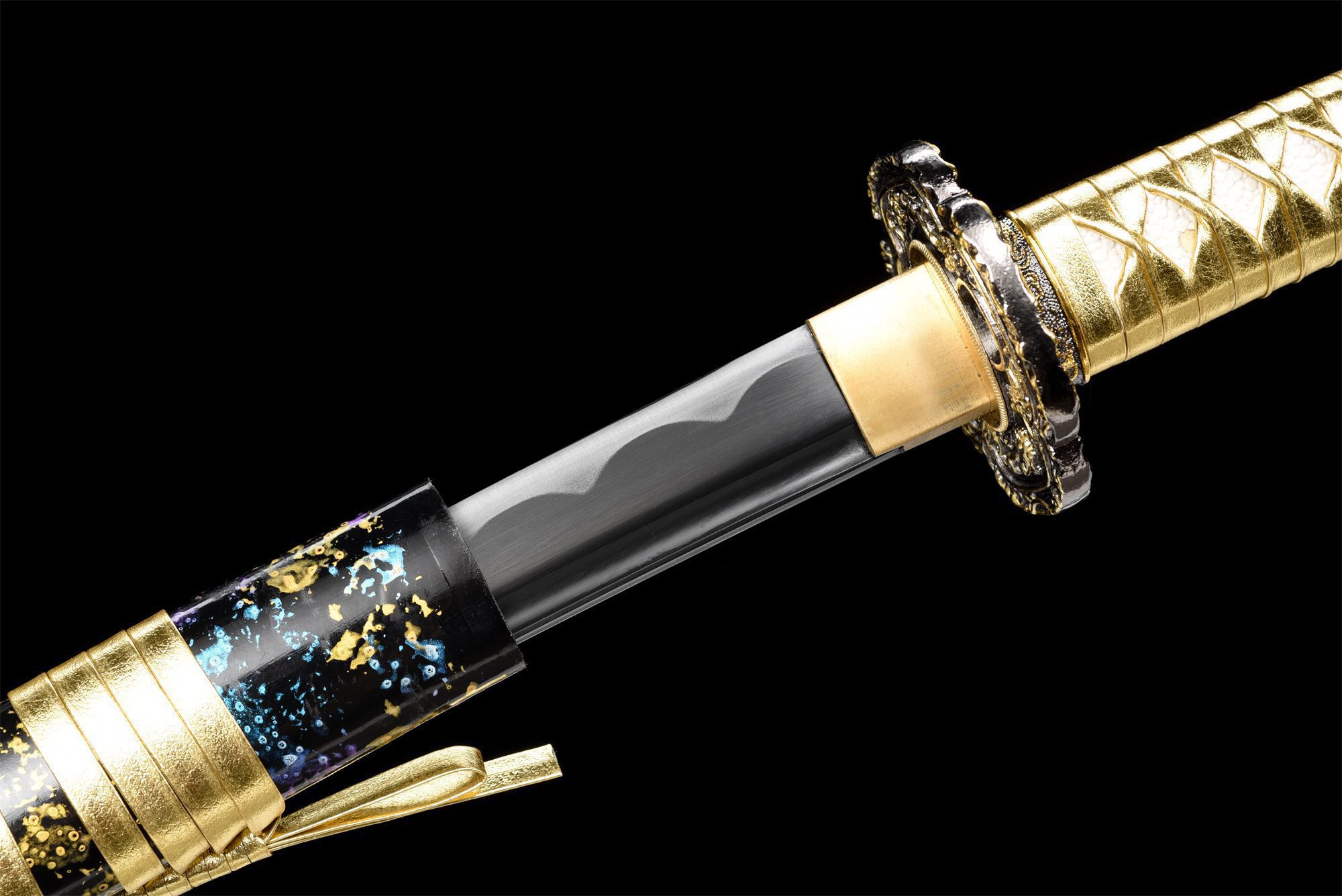 - Scabbard (Saya 鞘): Black lacquered wood with abstract blue and gold patterns evoking the depths of the ocean and the universe, black ends.
