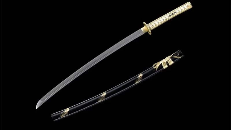 - Saya (鞘): black lacquered hardwood scabbard with gold feathers.