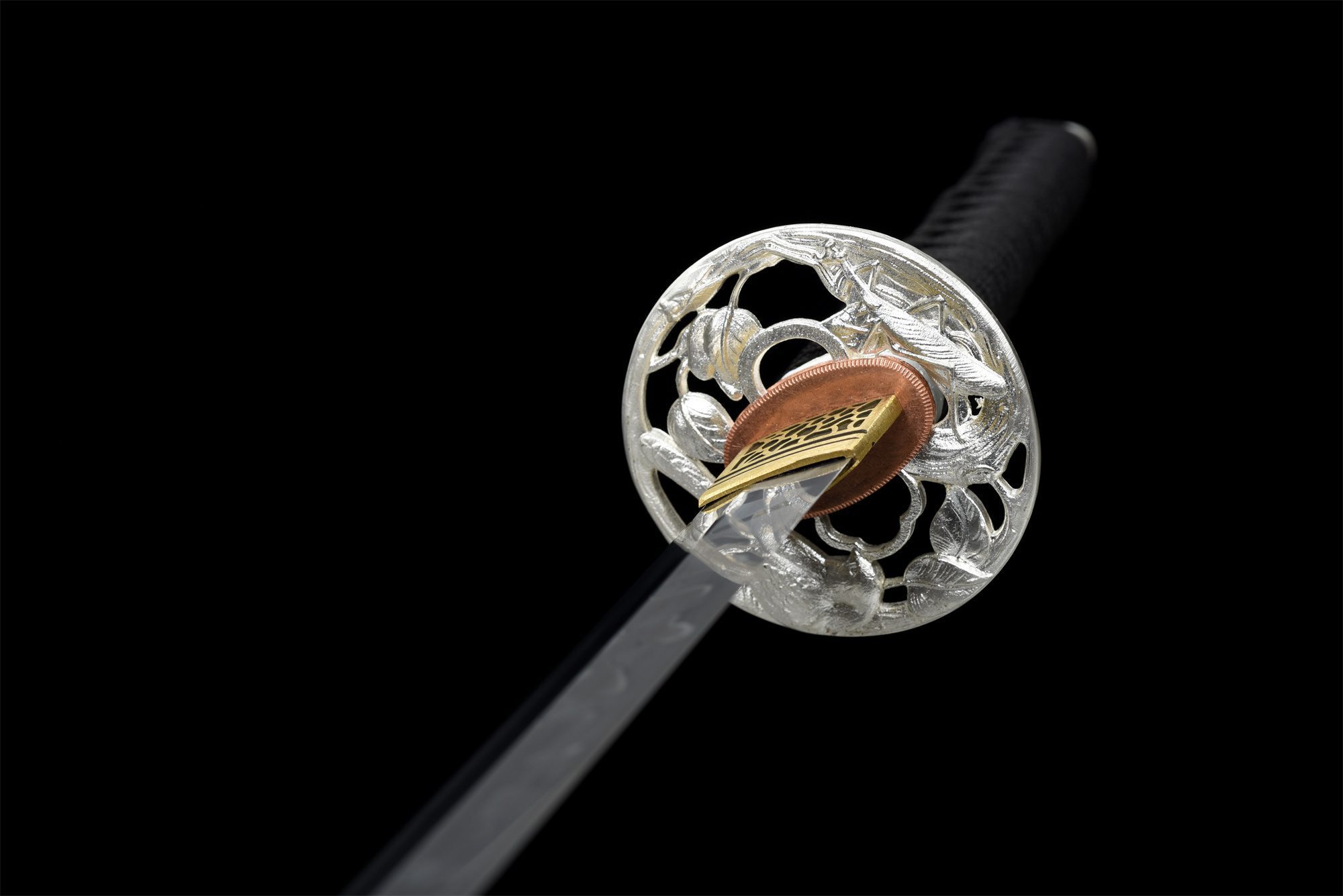 - Guard (Tsuba 鍔) : Rounded alloy shape, engraved with a tree motif and silver-plated.