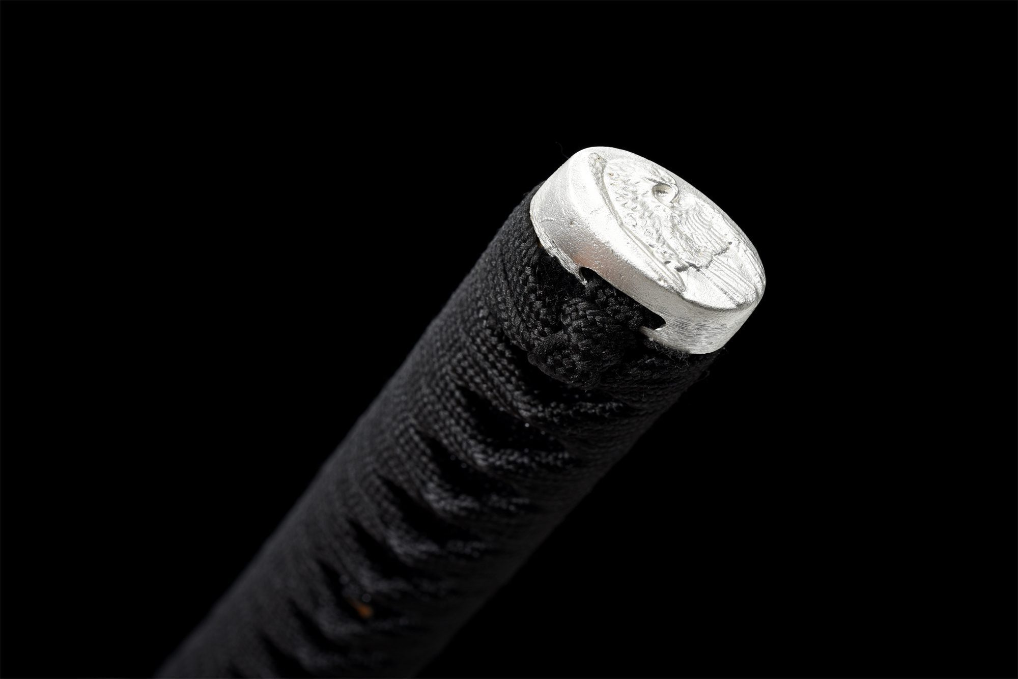 The T10 steel blade has a natural steel colour that reveals a subtle hamon, evidence of traditional differential tempering. The rounded silver-plated alloy tsuba features an engraved tree motif, symbolising growth and perseverance through the seasons. The handle harmoniously combines solid wood and black imitation stingray skin, while the black diamond-patterned tsuka-ito braiding ensures a firm and elegant grip. The menuki represent finely chiselled silver dragons, guardians of ancestral wisdom, while the matching fuchi and kashira feature delicate floral motifs on a silver background. The gilded brass habaki contrasts with its black patterns, creating a striking visual effect. The black lacquered solid wood scabbard is decorated with bamboo painting, evoking flexibility and resilience in the face of adversity.