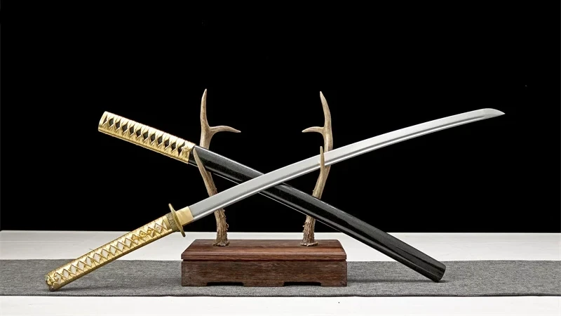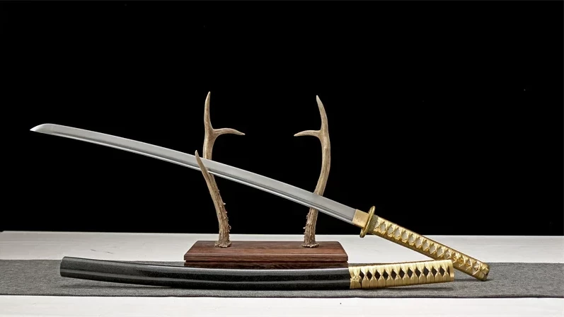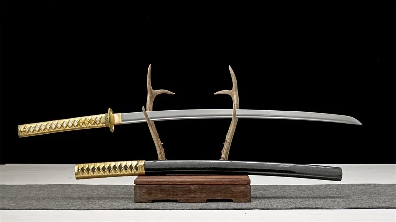 - Saya (鞘): black lacquered hardwood scabbard with the upper half covered with diamond-shaped braided gold ito.